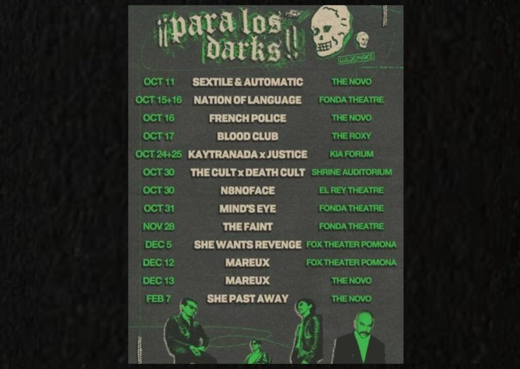 Casi es Día de Muertos…o Halloween, como lo quieras celebrar. Y previo a esa noche de brujas, L.A. se viste de negro con una serie de conciertos del ciclo Para los Darks, con bandas como French Police, She Wants Revenge, Blood Club y más, que invaden la ciudad.